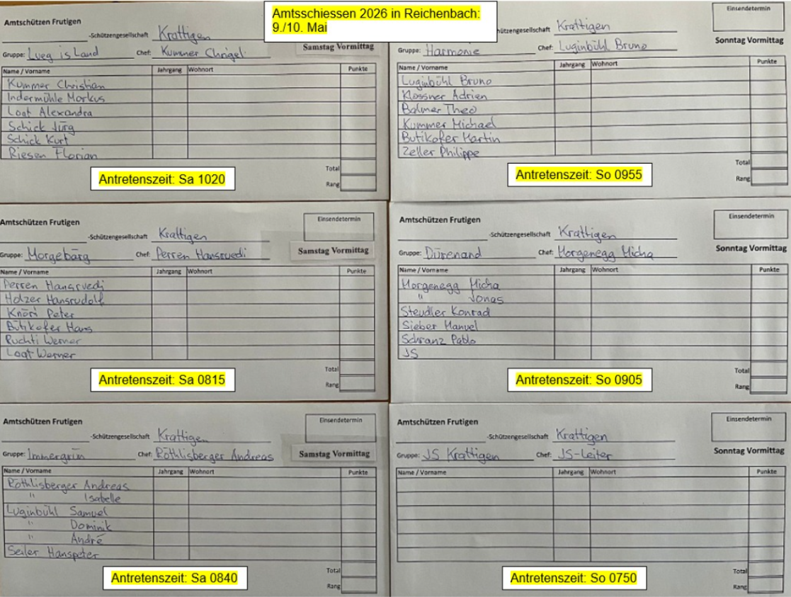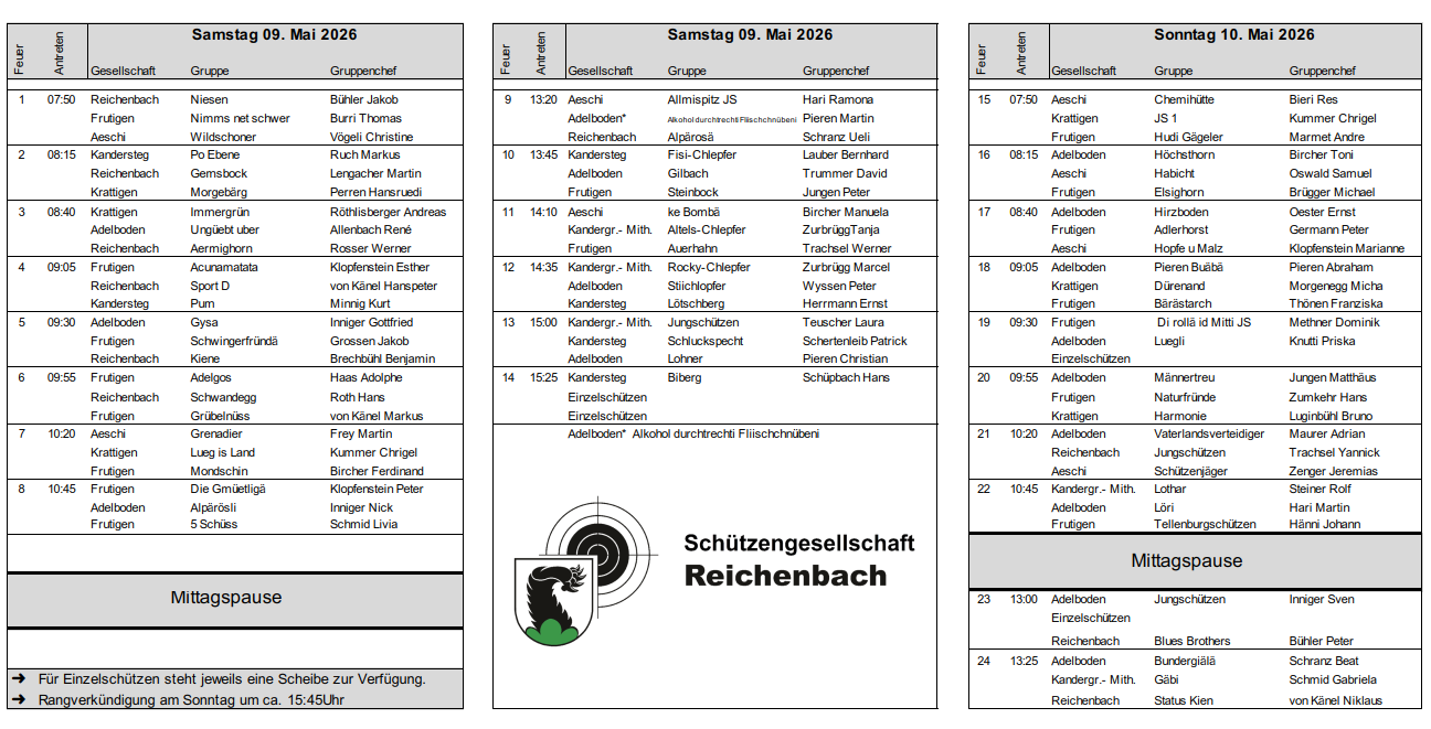 Gruppeneinteilung Amtsschiessen 2026 in Reichenbach vom 09/10 Mai 2026