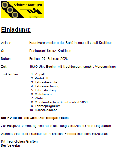 Hauptversammlung Schützen Krattigen findet am 27.Februar 2026 statt und ist für alle Schützen obligatorisch!